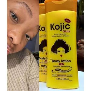 Une lotion corporelle éclaircissante de la marque Roushun, modèle Kojic Gluta. Action : Éclaircissement actif, réparation cellulaire et réduction des taches sombres.