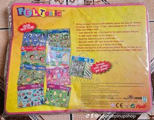 Figurines en feutre Disney Princess (souvent appelées « fuzzy felts »), présentées dans une pochette de transport rose. Ces types de jouets sont conçus pour encourager le jeu imaginatif, permettant aux enfants de placer et de déplacer les figurines sur la surface en feutre sans avoir besoin d'adhésif. Bien qu'elles ressemblent à des autocollants, elles sont réutilisables et adhèrent au tableau grâce à la texture du matériau.